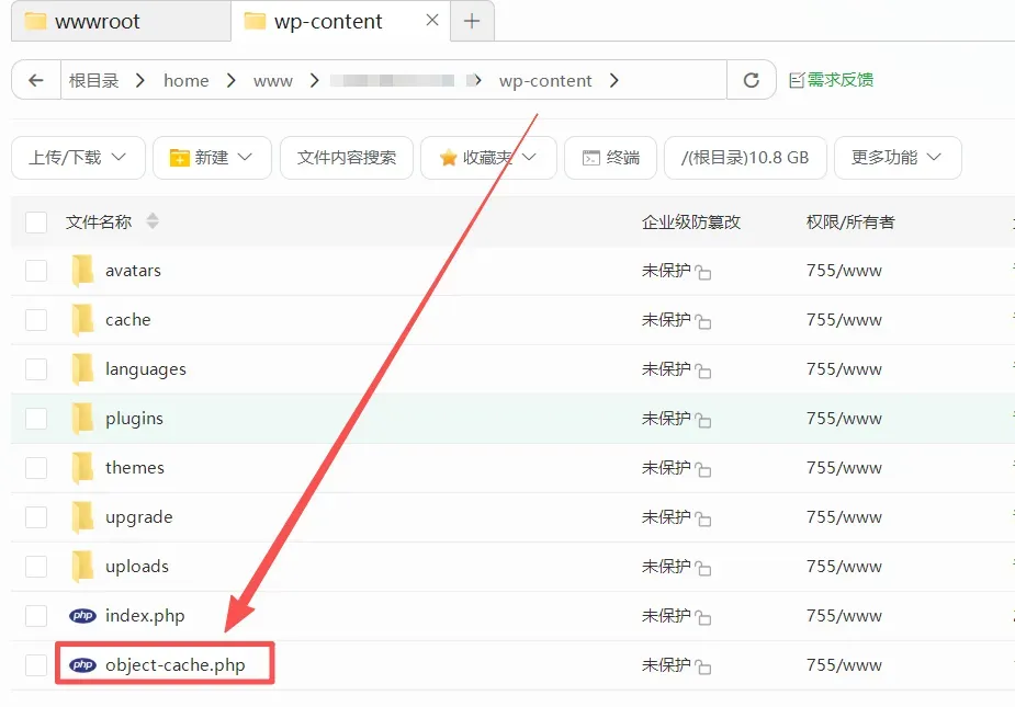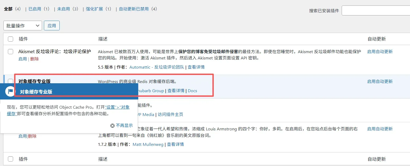 上传 object-cache-pro.zip 到 /wp-content/plugins 下解压,