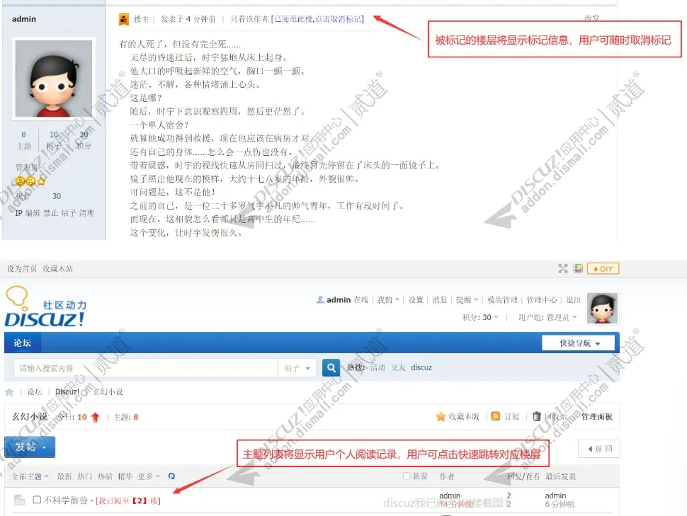 应用介绍用户可对主题进行阅读标记,被标记的主题将在主题正上方及帖子列表页显示标记信息(已阅至XX楼),用户可通过点击标记跳转至对应的楼层。与常规的"已阅至N楼"插件不同的是,该阅读标记信息仅用户个人可见,TA人无法查看您的阅读标记信息,该插件适用于文学、小说类或主题文字、楼层较多的社区,用户可对主题进行标记,下次可快速进行跳转浏览,避免多次重复浏览已浏览过的内容,提高用户体验。1、支持设置哪些版块允许使用此插件;2、支持设置哪些用户允许使用此插件;3、支持手机版。具体应用介绍请查看下方应用截图或咨询我方在线客服。