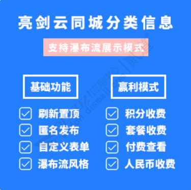 🔥 依赖说明同城分类信息插件可以独立运行,安装时会连带安装一个免费基础插件商家助手,支持人民币支付方式的功能对接的是钱包收银台,所以安装分类信息插件后还需要再安装下钱包插件(8.8元活动价)🔥 功能说明同城分类信息是亮剑云同城系统的主插件,支持瀑布流展示方式,无限创建分类,支持自定义表单,刷新置顶支持套餐收费,支持积分+人民币的付费方式自从2017年12月18日上线了第1个版本以来,历史累计已经更新了90个版本,共优化或新增了221个功能点,更多详情请查看更新日志【演示一】扫码查看演示:使用微信扫码后自动获取图文消息点击后即可进入演示(点击查看二维码)【演示二】关注公众账号:关注公众账号 ljy_sc(亮剑云商城) 发送: 分类信息 (点击查看二维码)【演示三】链接直达演示:您可将演示链接地址复制到浏览器上查看演示或者直接点击右侧链接(https://mall.liangjianyun.com/plugin.php?id=aljtc)针对没有的功能我们现在有提供了三种方案,同时针对这三种方案对工单系统进行了升级,大家发布工单时可以根据需要选择工单类型(免费/助力/定制) ,方案详情链接:https://www.yuque.com/sctc/common/zhuli🔥 插件介绍点击查看本插件的效果截图、演示与配置教程