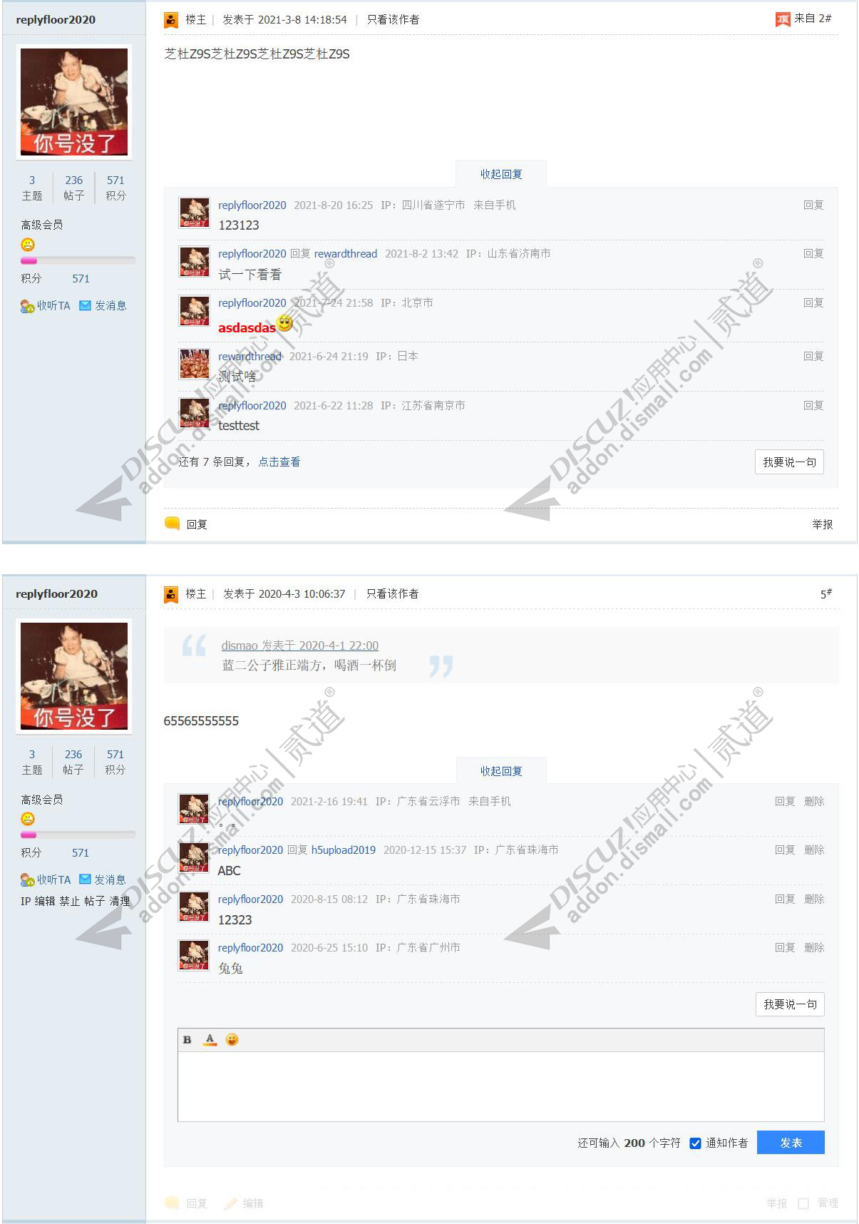 更新日志:9.4本插件可让用户在回帖楼层中继续回复,类似于百度贴吧的回复模式功能介绍1、可自由设置允许使用社区版块或群组分类。2、可自由设置楼层内回复的显示分页条数和默认显示条数(点击可无刷新分页)。3、可开启楼内回复奖励积分,奖励积分规则和发表回复一致。4、可开启楼内回复通知提醒对方,回复通知提醒对方和发表回复一致(可选择性提醒通知)。5、可选择楼内回复按回复时间正序或者倒序进行排列显示6、可开启楼内回复后使所在的主题提升到当前回复时间7、楼内回复的内容可支持表情的显示8、本插件功能同时支持电脑版和手机触屏版插件演示http://www.dismao.com/forum-52-1.html账号:replyfloor2020 密码:replyfloor2020