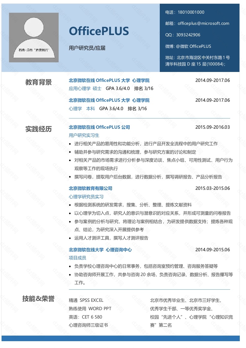 电话:18010001000邮箱:officeplus@microsoft.comOfficePLUSQQ:3093242906用户研究员/应届微博:@微软OfficePLUS地址:北京市海淀区中关村东路1号清华科技园D座15层(100084):教育背景北京微软在线OfficePLUS大学心理学院2014.09-2017.06应用心理学硕士GPA3.6/4.0排名3/16北京微软在线OfficePLUS大学心理学院2014.09-2017.06心理学本科GPA3.6/4.0排名3/16实践经历北京微软在线OfficePLUS公司2015.09-2016.03用户研究实习生·进行相关产品的易用性和功能分析,进行产品开发全流程中的用户研究工作·辅助并参与研究需求的沟通和梳理,参与研究方案的讨论和制定·对相关产品的市场需求进行分析参与深度访谈、焦点小组、可用性测试、用户行为观察等工作的现场执行·撰写问卷,提取用户后台数据,进行数据分析,撰写调研报告、产品分析报告北京微软教育有限公司2015.03-2015.06心理学研究员实习·根据检测系统的研发需求,搜集、分析、整理、提炼文献资料·以心理学为切入点,研究人的意识与潜意识的对应关系,并形成可测量的问卷报告·参与案例的分析与研究,将理论与案例相结合,为研发提供数据支持;提炼各种观点、结论,为研究深入开展提供参考·运用人才测评工具,撰写人才测评报告北京微软在线大学心理咨询中心2014.09-2015.06项目成员·负责学校心理咨询中心的日常事务,包括咨询室预约管理、咨询服务答疑等·协助咨询师开展工作,共参与咨询20余场,负责咨询记录、数据分析、报告攥写等工作。技能&荣誉精通SPSS EXCEL北京市优秀毕业生、北京市三好学生,熟练使用WORD PPT优秀学生干部、一等优秀奖学金英语:CET6580校园“先进个人”、心理学院“心理知识竞心理咨询师三级证书赛”第二名