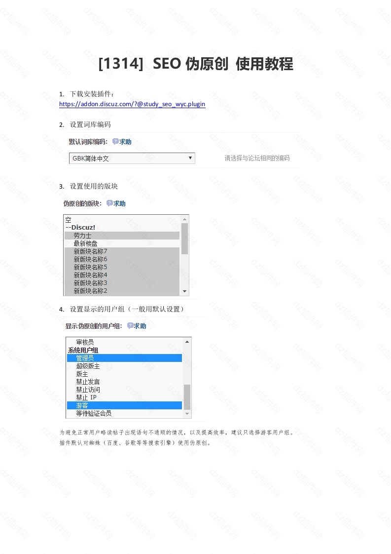 [1314]SE0伪原创使用教程1.下载安装插件:https://addon.discuz.com/?@study_seo_wyc.plugin2.设置词库编码GBK简体中文请选择与社区相同的编码3.设置使用的版块空Discuz!劳力士最新楼盘新版块名称7新版块名称6新版块名称5新版块名称4新版块名称3新版块名称24.设置显示的用户组(一般用默认设置)显示伪原创的用户组:?求助审核员统用户组管理员超级版主版主禁止发言禁止访问禁止IP游客等待验证会员为避免正常用户略读帖子出现语句不通顺的情况,以及提高效率,建议只选择游客用户组。插件默认对蜘蛛(百度、谷歌等等搜索引攀)使用伪原创。