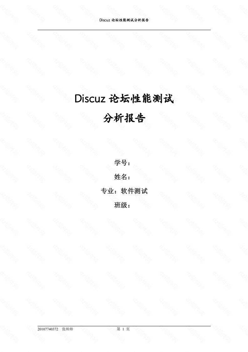 Discuz社区性能测试分析报告Discuz社区性能测试分析报告学号:姓名:专业:软件测试班级:20107740372张帅帅第1页Discuz社区性能测试分析报告目录1测试背景1.1测试目标1.2测试时间1.3测试地点..4...1.4测试人员2测试方法简介3测试环境…......23.1被测系统…23.1.1硬件环境23.1.2数据库环境23.1.3软件环境…33.2测试系统33.2.1测试环境搭建...44..4.43.2.2测试软件4测试设计…4.1模拟用户数.…4.2测试模型建立.45测试结果具体分析56测试结论39调优建议…408签字确认4020107740372张帅帅第2页Discuz社区性能测试分析报告1测试背景1.1测试目标对Discuz社区进行性能测试,客观、公正评估系统的性能现状。通过性能测试,客观、公正评估在当前测试环境下,被测系统的各项性能指标表现。1.2测试时间测试自2023年03月10日启动,至03月13日测试执行结束。1.3测试地点203寝室和机房1.4测试人员单位姓名备注郑大工学院张帅帅这是这学期的一个课程作业2测试方法简介压力测试采用Loadrunner性能测试工具,通过创建压力测试程序、构建压力测试模型,对被测试系统实施自动化压力测试,最后形成压力测试结果分析报告。20107740372张帅帅第1页
