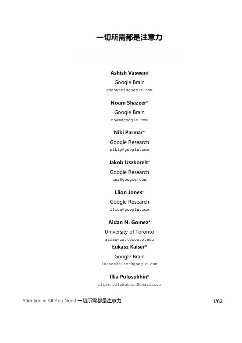 一切所需都是注意力Ashish VaswaniGoogle Brainavaswani@google.comNoam Shazeer*Google Brainnoam@google.comNiki ParmarGoogle Researchnikip@google.comJakob Uszkoreit*Google ResearchLlion Jones*Google ResearchAidan N.Gomez*University of Torontoaidan@cs.toronto.edutukasz Kaiser*Google Brainlukaszkaiser@google.comIllia Polosukhin*illia.polosukhin@gmail.comAttention is All You Need一切所需都是注意力1/62努力验证这个想法。Ashish.和Ilia设计并实现第一个Transformer模型,并在这项顶工作中的各个方面起着至关重要的作用。Noam提出缩放版的点积attention、muli-head attention和与参数无关的位置表示,并成为在几乎每个细节中都涉及的另外一个人。Nⅵkⅵ在我们最初的代码库和tensora2 tensor中设计、实现、调优和评估了无数的模型变体。L/ion还尝试了新的模型变体,负责我们的初始代码库,以及高效的推断和可视化。Lukasz和Aidan花费了无数的时间来设计tensora2 tensor的各个部分,取代了我们之前的代码库,极大地改进了结果并大大加快了我们的研究tWorkperformedwhileatGoogleBrain.Work performed while at Google Research.第31届神经网络信息处理系统会议(N川PS2017),美国加州长滩市。摘要主流序列转导模型基于复杂的循环神经网络或卷积神经网络,这些神经网络包含一个编码器和一个解码器。性能最好的模型还通过attention机制将编码器和解码器连接起来。我们提出一种新的简单的网络架构Transformer,仅基于attention机制并完全避免循环和卷积。对两个机器翻译任务的实验表明,这些模型在质量上更加优越、并行性更好并且需要的训练时间显著减少。我们的模型在WMT2014英语-德语翻译任务上达到28.4BLEU,超过现有最佳结果(包括整合模型)2个BLEU。在WMT2014英语-法语翻译任务中,我们的模型建立了单模型新的最先进的BLEU分数41.8,它在8个GPU上训练了3.5天,这个时间只是目前文献中记载的最好的模型训练成本的一小部分。通过在解析大量训练数据和有限训练数据的两种情况下将其应Attention is All You Need一切所需都是注意力2/62任务。1简介在序列建模和转换问题中,如语言建模和机器翻译[35,2,5],循环神经网络特别是长短期记忆13]和门控循环7]神经网络,已经被确立为最先进的方法。自那以后,许多努力一直在推动循环语言模型和编码器-解码器架构的界限[38,24,15]。循环模型通常是对输入和输出序列的符号位置进行因子计算。通过在计算期间将位置与步骤对挤,它们根据前一步的隐藏状态h和输入产生位置的隐藏状态序列h。这种固有的顺序特性阻碍样本训练的并行化,这在更长的序列长度上变得至关重要,因为有限的内存限制样本的批次大小。最近的工作通过巧妙的因子分解21]和条件计算[32]在计算效率方面取得重大进展,后者还同时提高了模型性能。然而,顺序计算的基本约束依然存在。在各种任务中,attention机制已经成为序列建模和转导模型不可或缺的一部分,它可以建模依赖关系而不考虑其在输入或输出序列中的距离[2,19]。除少数情况外[27],这种attention机制都与循环网络一起使用。在这项工作中我们提出Transformer,这种模型架构避免循环并完全依赖于attention机制来绘制输入和输出之间的全局依赖关系。Transformer允许进行更多的并行化,并且可以在八个P100GPU上接受少至十二小时的训练后达到翻译质量的新的最佳结果。2背景减少顺序计算的目标也构成扩展的神经网络GPU[16]、ByteNet[18]和ConvS2S[9]的基础,它们都使用卷积神经网络作为基本构建模块、并行计算所有输入和输出位置的隐藏表示。在这些模型中,关联任意两个输入和输出位置的信号所需的操作次数会随着位置之间的距离而增加,ConvS2S是线性增加,而ByteNet是对数增加。这使得学习远程位置[12]之间的依赖性变得更加困难。在Transformer中,这种操作减少到固定的次数,尽Attention is All You Need一切所需都是注意力3/62