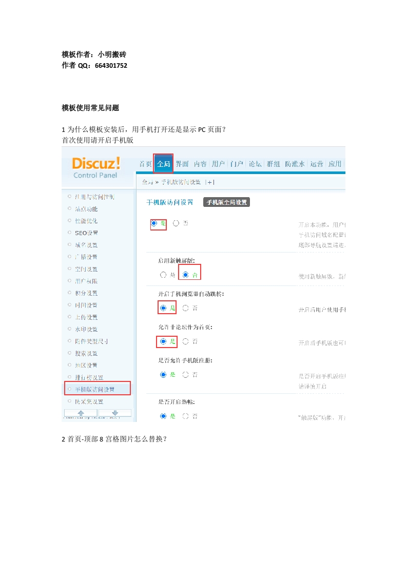 模板作者:小明搬砖作者QQ:664301752模板使用常见问题1为什么模板安装后,用手机打开还是显示PC页面?首次使用请开启手机版Discuz!Control Panel手机版全局设置启用新触屏版:开启后手机版也可1足否允前手机版注册:是否开启热帖:2首页-顶部8宫格图片怎么替换?6:017豆果美食三Q输入关键词搜索家常菜下饭菜小吃汤早餐凉菜素食全部食谱分类图片存放的文件地址:template\xmyc_.touch_food\static\image\mobile\forum,做好图替换以下文件即可。常lurum-2.pr修改跣转地址,修改文件为template\xmyc_touch_food小touch\portal\index.htm
