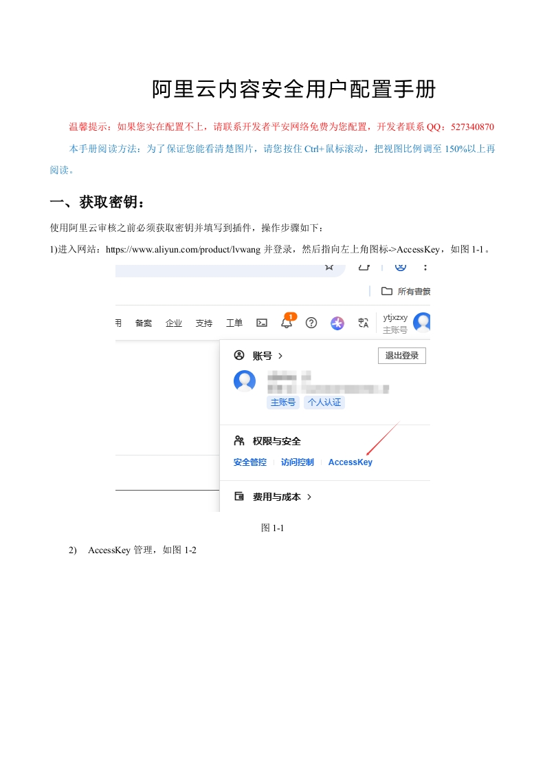 阿里云内容安全用户配置手册温馨提示:如果您实在配置不上,请联系开发者平安网络免费为您配置,开发者联系QQ:527340870本手册阅读方法:为了保证您能看清楚图片,请您按住C+鼠标滚动,把视图比例调至150%以上再阅读。一、获取密钥:使用阿里云审核之前必须获取密钥并填写到插件,操作步骤如下:l)进入网站:https::/www.aliyun.com/product/lvwang并登录,然后指向左上角图标->AccessKey,如图1-l。用备案企业支特ytjxzxy主账号退出登录主账号个人认证安全管控AccessKey图1-12)AccessKey管理,如图1-2AccessKeyRAM图1-23)选择“创建AccessKey”,如图1-3创建AccessKey●当前窗口关闭后,无法再次查询Secret,清妥善保管。若丢失AccessKeySecret,需创建新的AccessKey。AccessKey IDAccessKey Secret业下裁CSV文件可复制☐我已保存好AccessKey Secret配置网络访问策略确定注意:新建密钥以后,一定要妥善保存密钥,因为在线上只能看一次。4)把密钥的AccessKey ID和AccessKey Secret填写到插件的对应接口,如图1-5节点:cr-shanghal图14